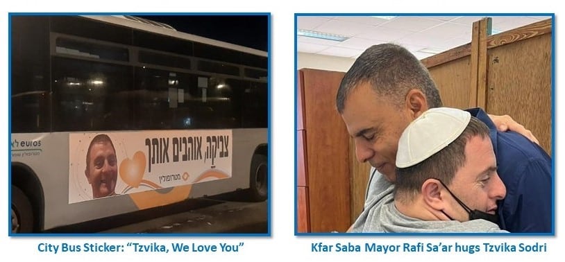 Since the attack, there has been a community and country-wide outpouring of love and support toward Sodri, who was both physically hurt and mentally traumatized by the incident. Mayor Rafi Sa’ar who has known Sodri since they were children, made a surprise visit to him during his workday at the Chimes Israel Kfar Saba Center. In addition, the Kfar Saba city buses put huge stickers on their buses with Sodri’s picture and the words in Hebrew, “Tzvika, we love you!”